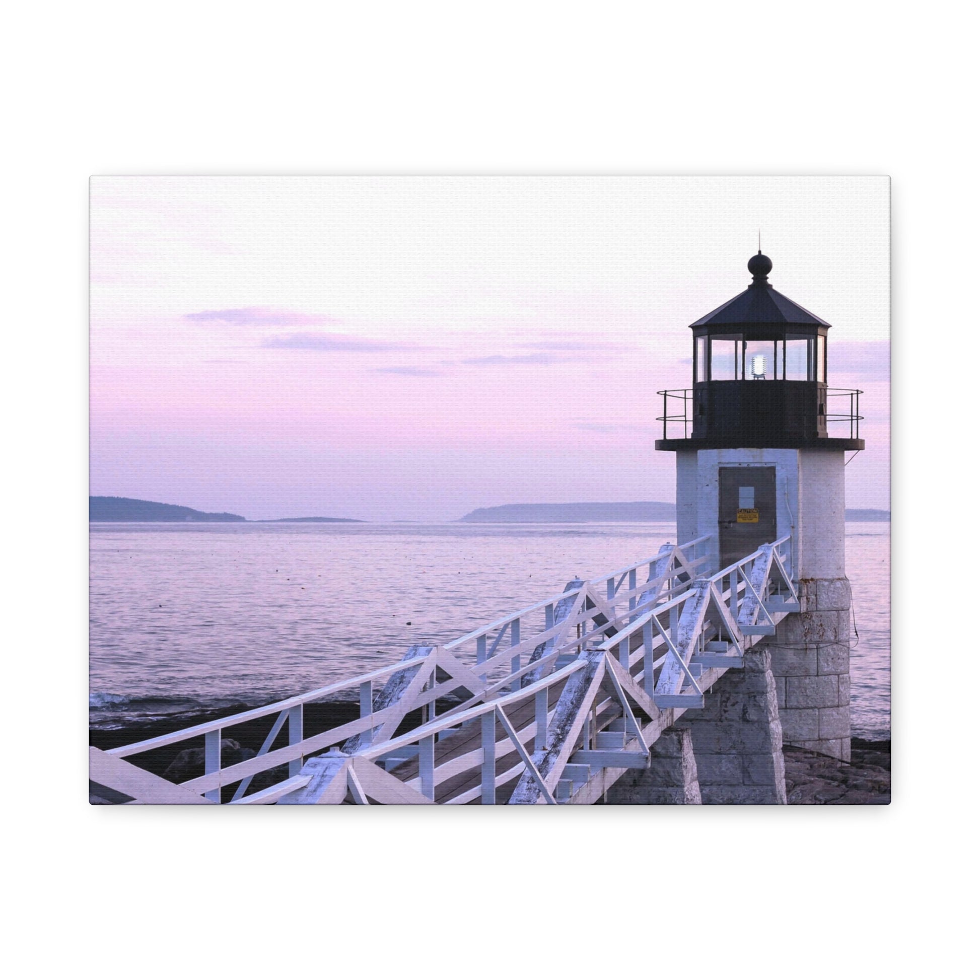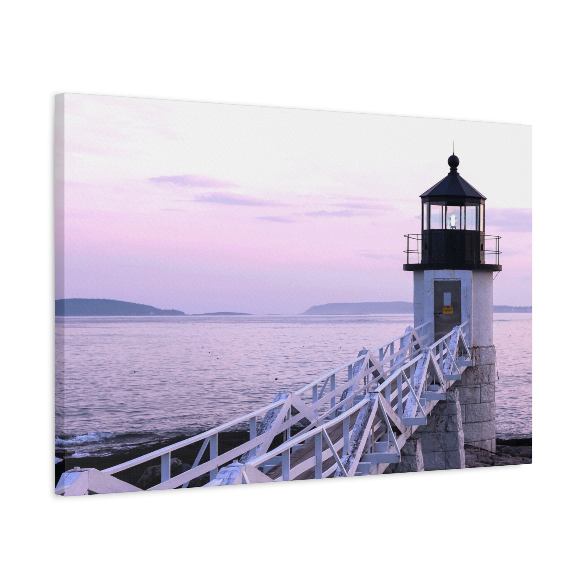 Bring the serene feeling of a lighthouse off the coastline into your space with this matte canvas print. The light purplish hue and foggy atmosphere create a calming vibe, perfect for a living room or bedroom. Ideal for lighthouse enthusiasts or those who love coastal decor. Relevant for home decor, coastal-themed decor, or as a gift for lighthouse lovers on birthdays or housewarmings.